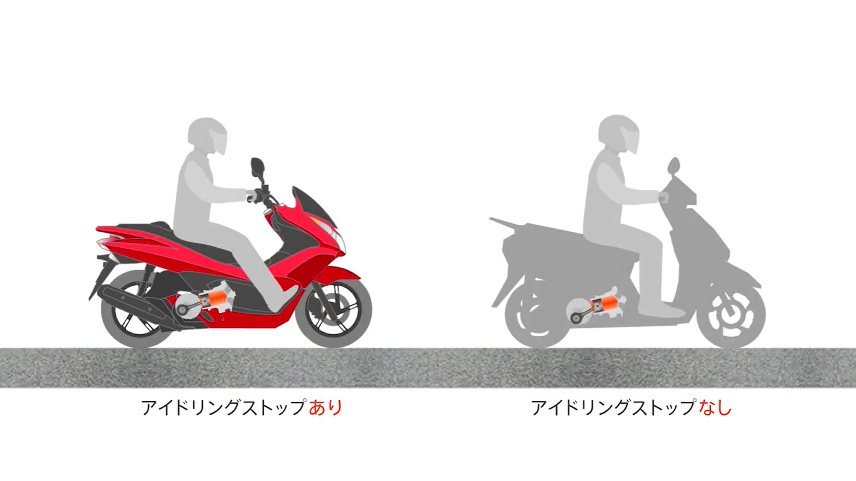 信号待ちでエンジンが自動停止し、スロットルをひねるとすぐに再始動する仕組みです。
